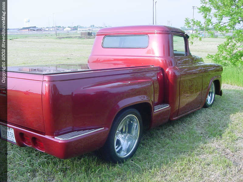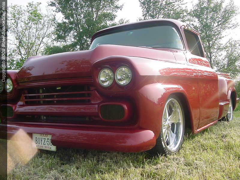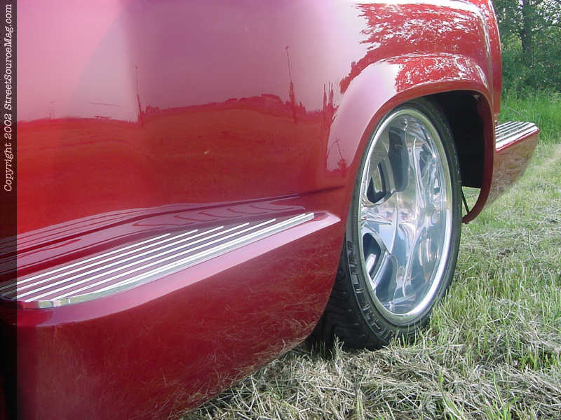 Adding to the body modifications Billy had the top of this 58' chopped 3" and custom glass installed to accommodate the chop. With the cab and fenders taken care off Billy decided to junk the factory bed and go with a 90's model step-side bed and adding to this Billy molded in a ZR-1 roll-pan, billet specialties step plates and a relocated gas neck behind the flip down license plate.  Once the bodywork was finished Billy had Legacy Paint and body of Garland Texas lay down the fire mist red paint in excellent fashion to bring this truck to life.