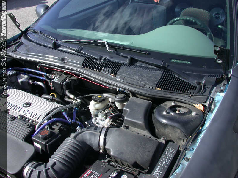 The first step of installation on the beast is to open the old hood and remove the bolts holding the hood on the hinges. I'd grab a friend to help you cause this is a pain to do by yourself, trust me I know. In this picture (below) you can see the hood removed showing the Z24 2.4L engine. Now, lie the hood down on a soft surface so you can remove the hood latch from the old hood (we need it for the new one).