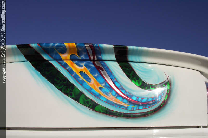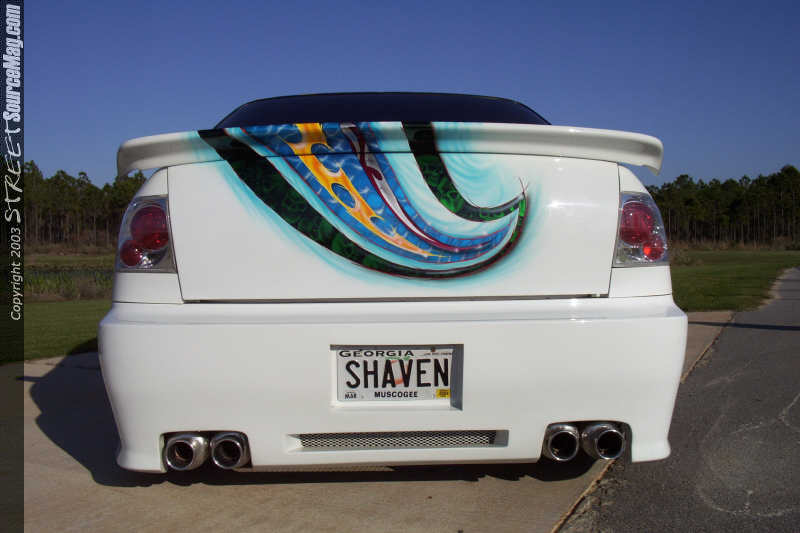 Once Allen had the Civic ready for paint he laid down numerous coats of Honda Olympic white paint to the body. Once Mitchell picked the car up from Allen he noticed that the plain white hue was not going to make the car stand out enough in the crowd so he called upon the artistic styles of William Boswell at Wild Airbrush in Columbus, GA to lay down the multi-colored airbrush theme over the entire body of the Civic.