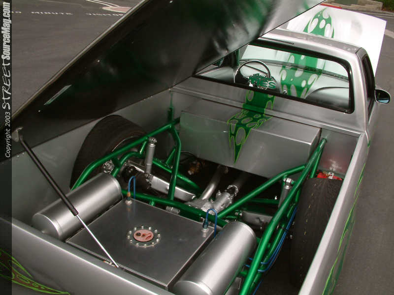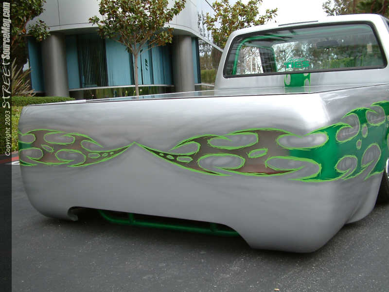 The marker lights in the front bumper where shaved along with the bumper and valance being molded together. The rear bumper was a creation of Josh's own, like most items found in this build up. The door handles were shaved along with the gas filler door. Now to fill the gas Josh goes directly to the fuel cell located under the tonneau cover.