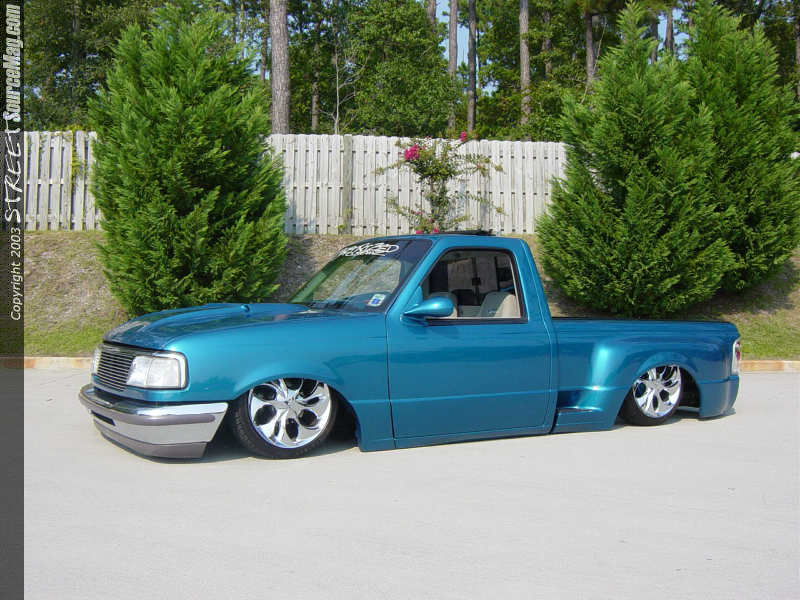 The truck is a 1997 Ford Ranger Step Side standard cab. About four years ago he decided to tear it apart to build to the level you see here. After stripping the body off the frame Lil' Bubba with the help of the guys at Str8twizted Customs in Kannapolis, NC decided to do a 3.5" body drop. While the frame was just lying in the shop, they decided to do a full custom rear frame clip using 2x3 square steel.   After building the C-Notch they decided to add a custom flamed bridge,