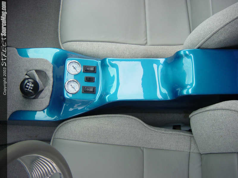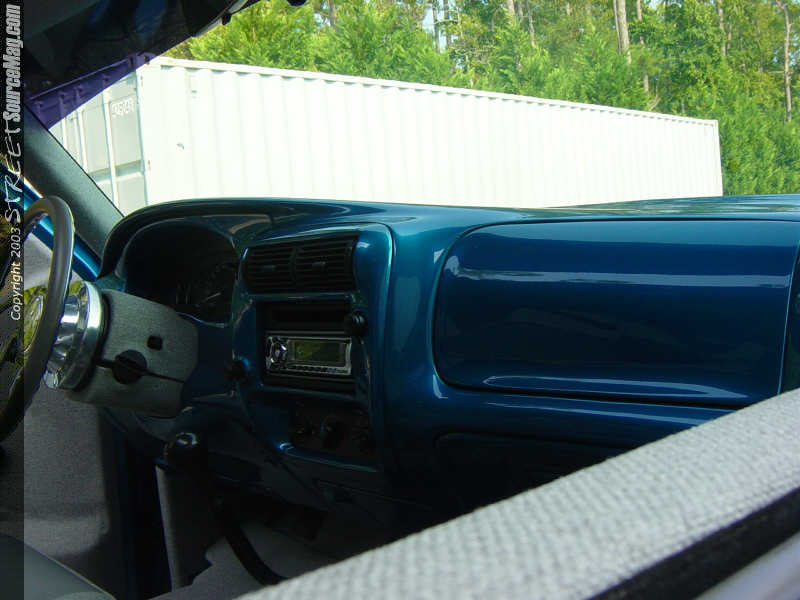 With a frame and body setting standards like that for the truck, it was necessary to have an interior that could hang with the rest of the mods. The dash along with the custom center console and parts of the door panels and stereo were smoothed and painted to match the truck.