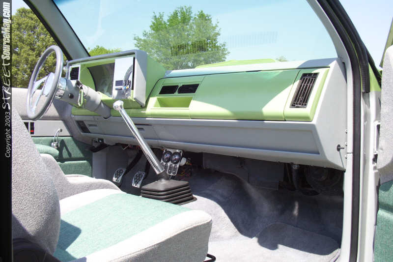 One of the final orders of business was the interior of the open air cruiser. Chico removed he dash and treated it to the same custom mixed Cyber Green as the exterior was treated to.   Moving to the seats Chico chose a set of Recarro buckets. The seats, door panels, and center console were delivered to the sewing skills of Auto Tailors in St. Peters, MO for them to ad a custom mixture of green and gray tweed.