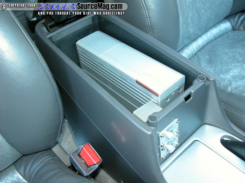 The guys at Expert Car Audio in Grand Prairie, Texas built a custom fabricated center console to house Mark’s Panasonic 9000 DVD/CD player with flip out screen and his Audio Control 3.1 EQ.   Hook all that into HiFonic 5” comps (pods), Polk 6.5” doors, and Polk 6x9 rear fill and things start to sound quite tantalizing.