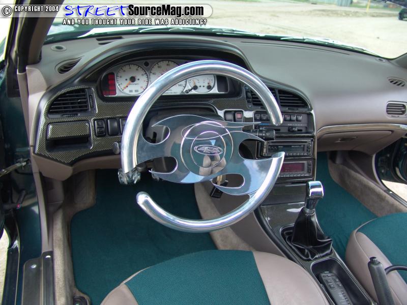 Speaking of the interior, it was all stripped out to make room for the beige leather and green tweed. Some of the tweed work has raised flame graphics for a few extra show points.   The ugly stock steering wheel was scrapped for a full billet half tribal wheel. The dash was treated to a full carbon fiber kit with an aluminum gauge bezel. Tony Plummer at Unique Interiors in Bristol, Tennessee did the seats and other stitch work.