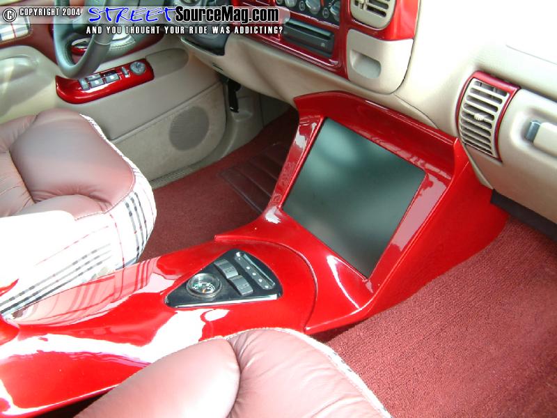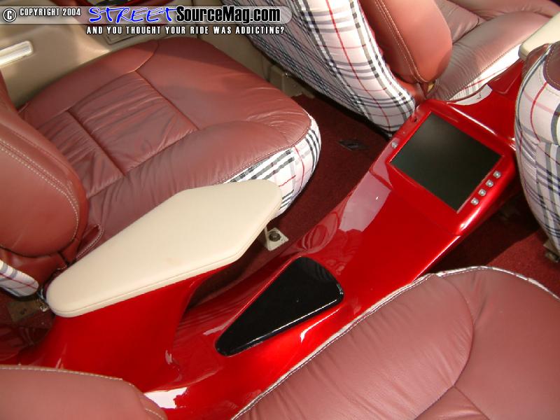 With the bench gone in the rear Greg would utilize the new open space with a custom built 5 foot center console which holds a 14 inch monitor, air ride controls leading to an 8 inch monitor with custom arm rests built in between each monitor. Classic Soft Trim of California is responsible for the interior work.