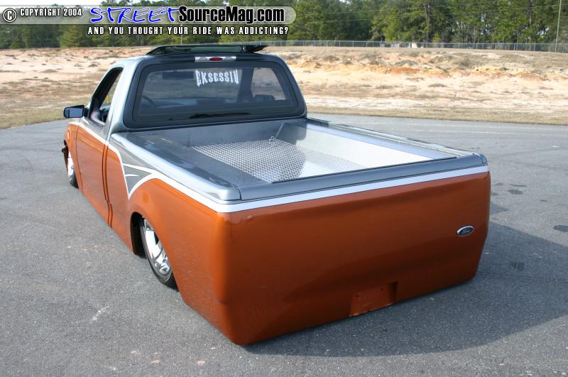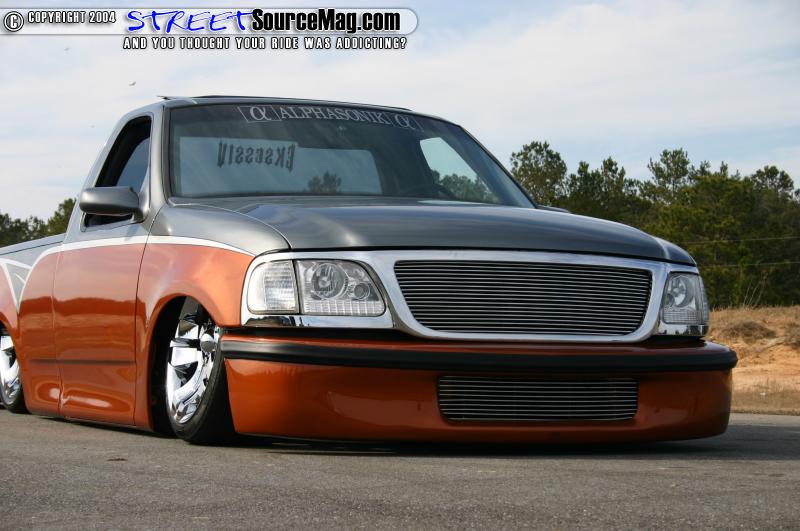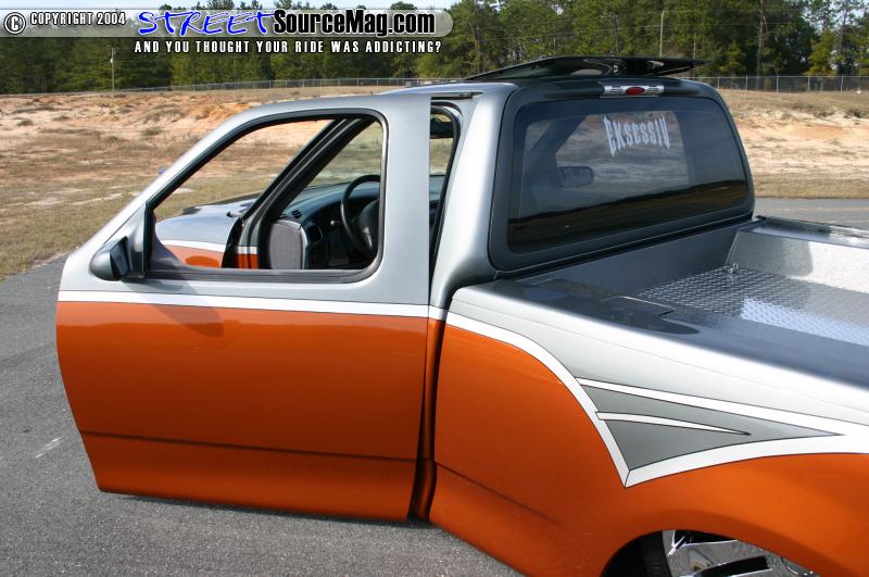 The bed features a clean and smooth setup along with some diamond plate filler panels. A modified front bumper, billet grille, chrome grille shell, and APC lights all set off the front of Joeys 150. Shane Barton then laid down the PPG burnt orange and grey paint job with a silver graphic emphasizing the two colors. The graphic was outlined in black to set it off from the other colors.