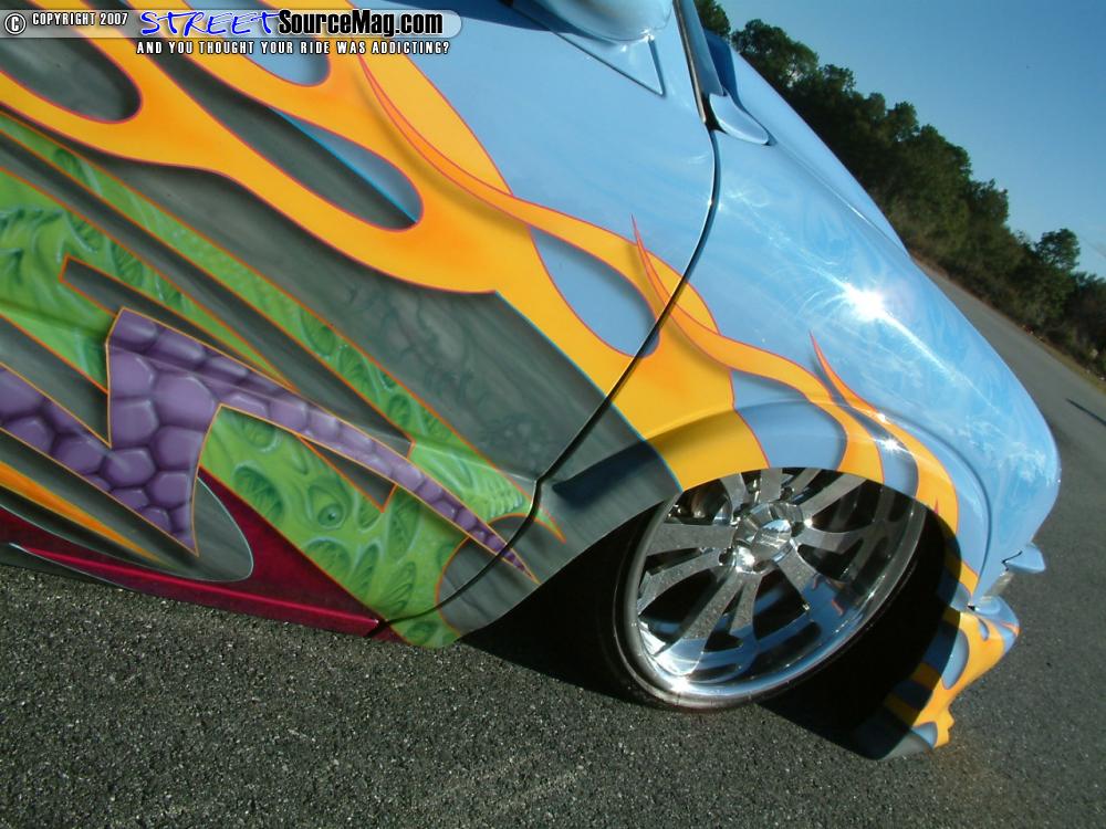 The suspension would then be powder coated gray with a light flake along with the brake drums and dust shields. The front would then be tubbed to allow room for the 18 inch Bonspeed Laguna’s while the rear was tubbed to fit the 20’s. Keeping the frame and body in good shape a 1-inch drag plate on the rear of frame would be welded up.
