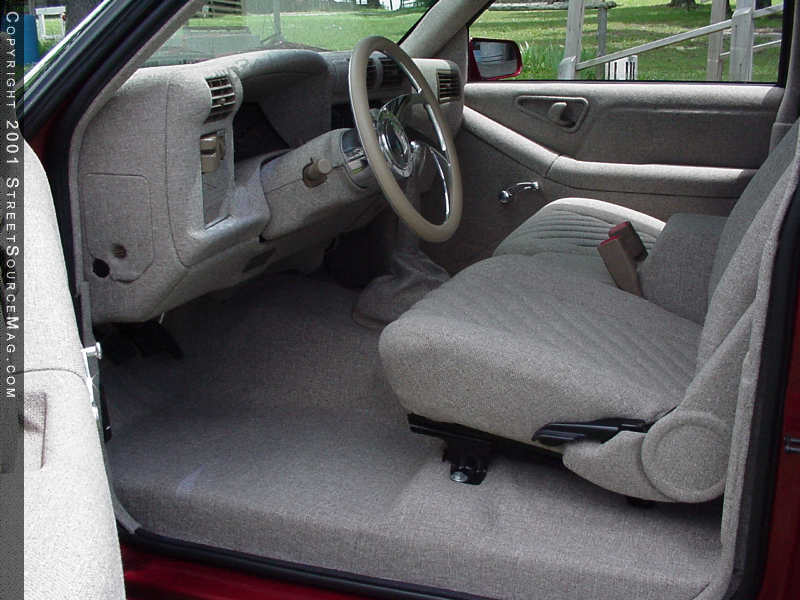 The next stop for Mike's S-10 was Frisby's Hi-Tech in Marshall, NC. Greg Frisby went straight to work shaving the door handles, tailgate handle and antenna. Frisby then welded in a Sir Michael's steel rollpan. With the engine and transmission out, Frisby smoothed the firewall for added show points. Frisby bolted on a bumper and valance combo from a '98 S-10. Now, smoothed and ready for paint, Frisby used PPG Dark Cherry Red Metallic to bring Mike's S-10 to life. To finish the exterior, clear corner lamps were bolted in place. Going full show means changing everything, interior included. Mike did just that. Changing the factory grey cloth out, he chose oatmeal tweed and went straight to work. Mike wrapped the dash himself, and with the help of friends and family, treated the rest of the interior to same level of attention. The factory seats were ditched and in their place a set of '86 S-10 Blazer seat covered in oatmeal tweed bolted in. Flamed door panels were installed as well and flames throughout the rest of Mike's S-10. Everything was changed to match, including the seatbelts and vents. A billet rear view mirror was put in place and finishing things off, a Billet Specialties Spyder 2 steering wheel was added.