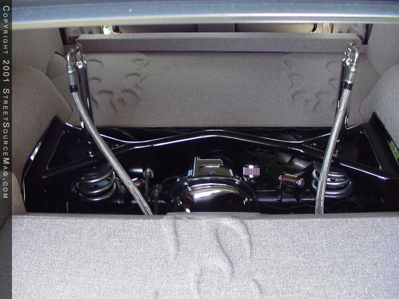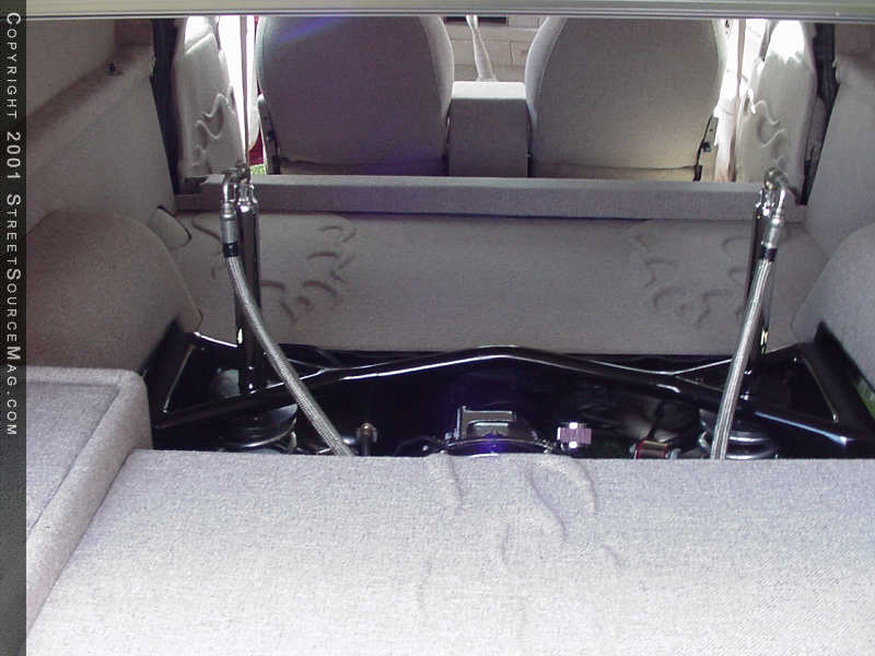 The engine compartment of Mike's S-10 was treated to several chrome and painted goodies. Clean is the main key to winning shows and Mike's engine is as clean as they come. To get a little performance from the stock 2.2 liter 4 cylinder, Mike added a chrome Hot Shot intake.