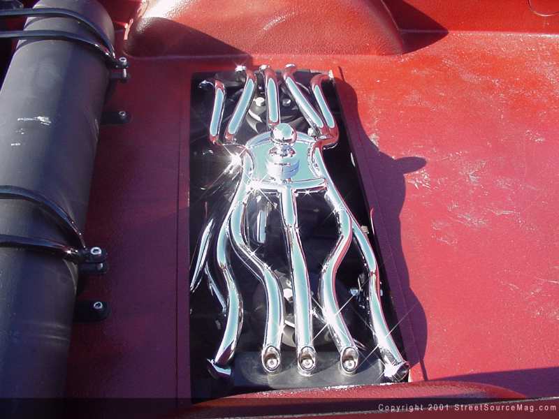 Providing the air to the bags Bill would continue to use the 3/8-inch line along with his very own Ekstensive valves. With the Dually now laid out nicely front to back, Bill found the wheels turning once again not being totally done with the rear frame section. Knowing that this rig would be towing weekend after weekend, Bill came to the conclusion that a gooseneck would be the ultimate solution for the enclosed trailer he had his eyes set on. Keeping to the "first to do" theory, The Ekstensive crew came up with the idea of many different styles of removable step notch's with wicked designs. With this newfound notch, the current one Bill was previously happy with was cut out and replaced. The notches made by Ekstensive have unique designs along with being chrome plated. Are they sturdy and can they handle day-to-day driving? Well the one installed into Bill's ride is fitted with a gooseneck ball and hauls the enclosed trailer filled with rides from coast to coast, so you tell me.
