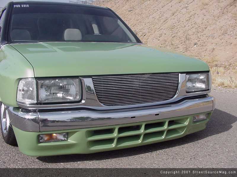 With the body laying on the ground and the suspension mods complete, it was time for Kevin to get busy on the exterior. Starting with the front of the Pup would require much desired work. Kevin's decision was to first swap out the front clip with one of an Isuzu rodeo. To do this, the stock hood, fenders and headlights would be set out for the trash man and the new panels would be bolted up. Kevin would next bolt up a billet grille into the new Rodeo chrome grille. With the hood squirters no longer, it was time to hit the cab to ensure the modifications make their way around the entire truck. Kevin would then have a set of Harley Davidson sportster mirrors mounted to give the truck a true pimp status. With the mirrors on the door, the decision was to remove the door handles to bring a smoother look about.