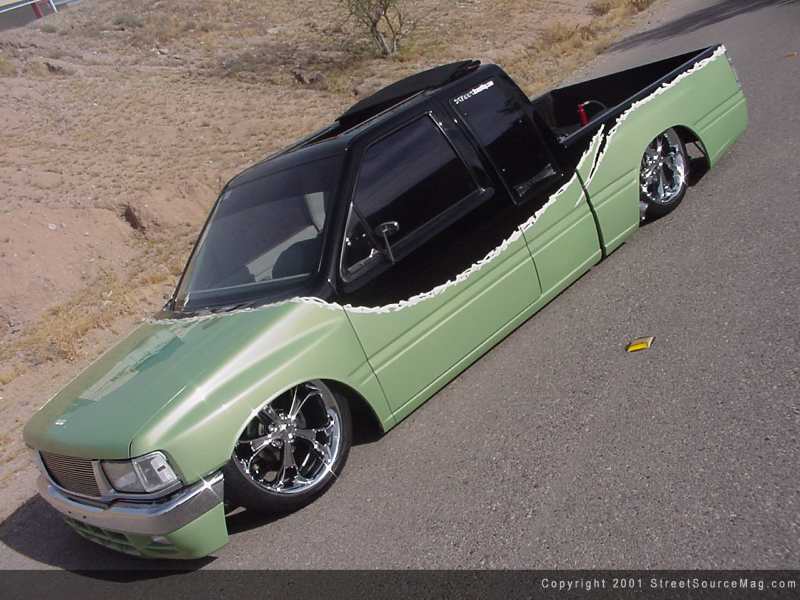 Now a-days 20's are found on quiet a few minitrucks, but unlike most, Kevin made the Isuzu lay all the way around with 20's. Not just on the rear like most commonly seen to date. In order to accomplish this, the firewall would need to be moved in to make room for the wheels. The rear wheel wells would be removed and custom tubs added to give the truck a clean appearance in the bed. After all panels where welded in place, Kevin had the bed Line-X'd to protect the floor, walls and new custom tubs.