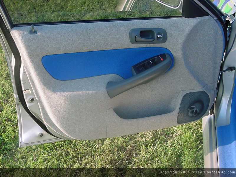 Levi still hasn't replaced all the stereo equipment but he did start the rebuilding process with a new body kit from wings west and replaced his wheels with 17" Enkie Wave 1's wrapped in some Nitto NT450 205 40s. From there Levi took the car to Massy's trim shop in Tulsa where the interior was completely wrapped in gray and blue tweed leaving the dash stock for other plans.