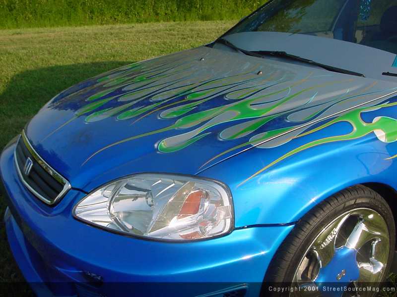 With the car looking show worthy it was time to beef up the little 4-banger to keep up with those on the Fast and the Furious. First off Levi junked the muffler and hooked up a Tenzo R cat-back system. With the car now sounding like a bumblebee, Levi strapped on an AEM cold air intake to get the engine some fresher air and a Tenzo strut bar to keep the corners tight. Along with the Chrome intake and strut bar Levi has plenty of wire loom and Doughboys to make this a show-winning engine.