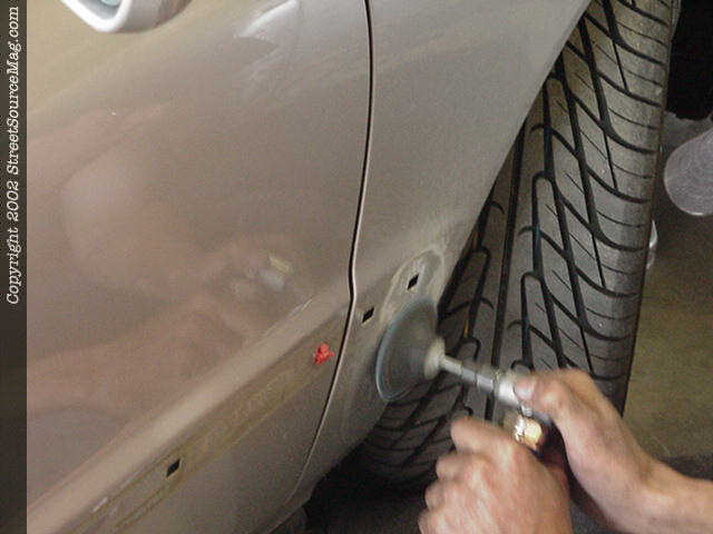 4. Now that the moldings are off it's time to remove access sticky tape and clean them up. 5. You will need to grind each hole complete of paint to allow a good weld to fill in the holes. We recommend removing the door panels before welding. With the door panels off you can then place small pieces of metal behind the holes to be tacked to close the hole. 6. With the doors cleaned up, it is time to tack up the holes. Be sure to let each hole cool off after each tack so that you do not cause the body to warp.