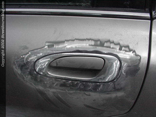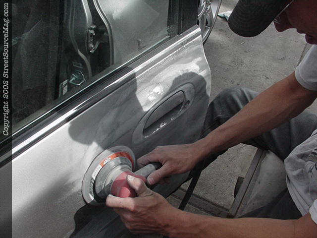 6. Once the door handle is back in place and the ready for the Everglass, you will then need to grind the paint off the door. Make sure and get a good couple of inches around the door handle for an even bond of Everglass. 7. After the Everglass is applied, then sand down smooth and glaze over it with spot putty to take away any low spots in the work.