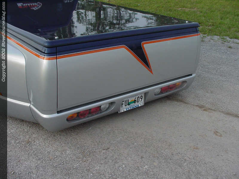 Mayo's Body Shop in South Fulton, Tennessee was called upon to give Nelson's beast life. The crew at Mayo's two-toned the dually using Ford Frost Silver and Indigo Blue, then separated the two color with a small, but subtle graphic using House Of Kolor Tangelo Orange.   The truck was then cleared and sanded to a bright, glossy shine.
