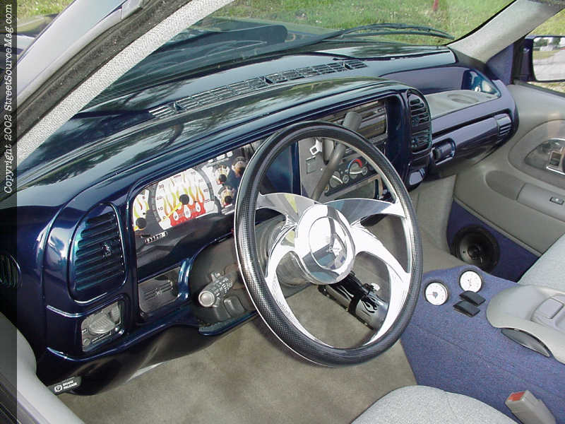 Inside the cab, Nelson used his own talents with the help of his friends to create a definite award-winning interior. Kenny Shaw from Troy, Tennessee got the ball rolling by shaving the headrests and stitching the stock seats in interlude gray and Nordic tweed. The door panels were removed and special pods housing the Audio Art separates were created, before being wrapped in matching tweed. Other items including the headliner and floor were also color matched utilizing interlude gray and Nordic tweed. The dash was removed, sanded and prepped by Nelson and his friends before KUSTOMWERKS laid down the glossy Indigo Blue paint, giving it a special appeal.