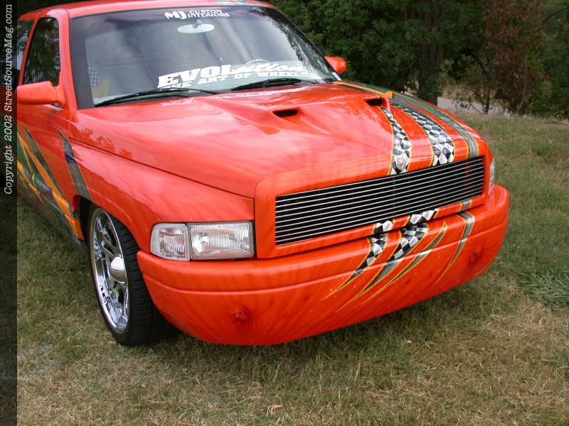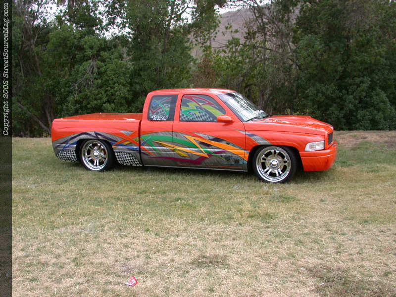 Moving to the rear, the doors would be shaved of the handles and the stock mirrors where replaced with a set of Street Scene mirrors. The gas filler was shaved smooth and relocated into the bed. When you get to the rear of the Ram you first notice the 1978 Caddy taillights frenched in replacing the stock lights.
