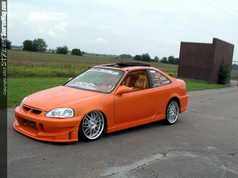 Luke went over the entire car multiple times wet sanding and re-priming the car until it was in mint condition. With the body now ready to accept it's new hue Luke and the crew laid down generous coats of Lamborghini Orange from PPG. Once the body was dry projector headlights were installed into the front clip. In true mini trucker fashion Luke installed a StreetBeat sliding ragtop into the skyline of the Civic.