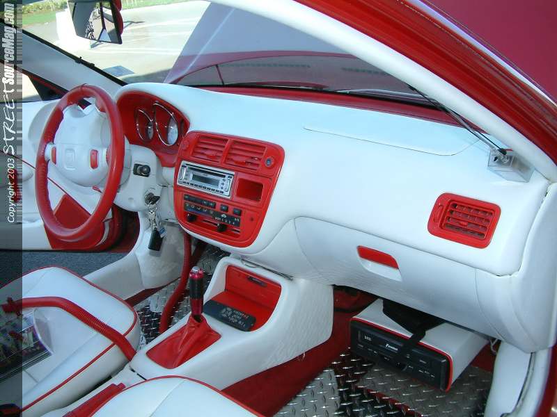 With the exterior complete it was time to take his Civic to South Bay Upholstery of Gardena, CA. While in their possession the dash, door panels and headliner would all be wrapped in white vinyl along with other interior pieces. What ever wasn't wrapped was then dyed to make sure the interior flowed like the exterior.