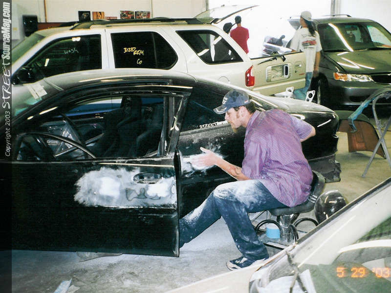After it is all done, porkchop repairs the imperfections in the z3 fenders (it is an aftermarket part and there are always imperfections) Photos of the repairs after the 2nd coat of glaze before it is blocked. After this, the fenders were block sanded and prepped for paint. PorkChop sands like a madd man on minor repairs dents and dings in the body. For the most part the body was straight, but perfection is always good!