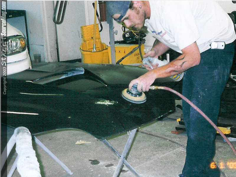 PorkChop had to straighten out the crotch rocket gas door (not quite done right by somebody who will remain nameless). Now it is blocked and ready to rumble. Here is where we get to the good stuff!! The carbon fiber flames are... well... SICK!First he wet sanded the hood with 500 Grit.
