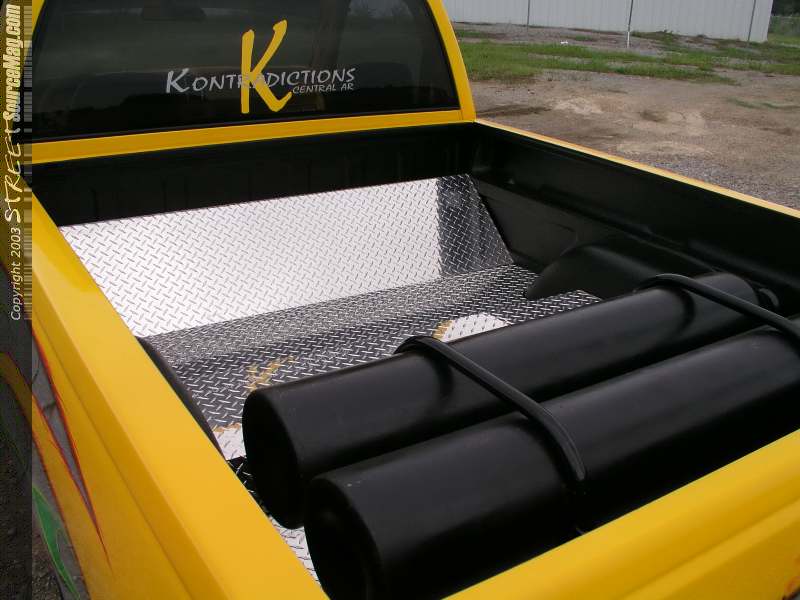 To give the rearend the same smooth ride another set of BellTech shocks was added to the mix. To give the bags the pressure they needed four Thomas 317 compressors were added along with two 5-gallon air tanks. To supply the air to the bags and for control off all four corners (8) ½" Parker valves were plumbed thru ½" stainless steel tubing.  For times when compressed air just wouldn't hack it Jessie opted for a 2 nitrogen bottle set up in the bed area of the GMC. To finish that suspension off Jessie decided the truck needed some new wheels so he called upon Eagle Alloy Wheels for a set of there new Eagle 212's in the form of 20's wrapped in B.F. Goodwrench 245/40/20 skins. Now that Jessie had the GMC's frame planted firmly on the ground it was now time to tackle the other projects that lay ahead.