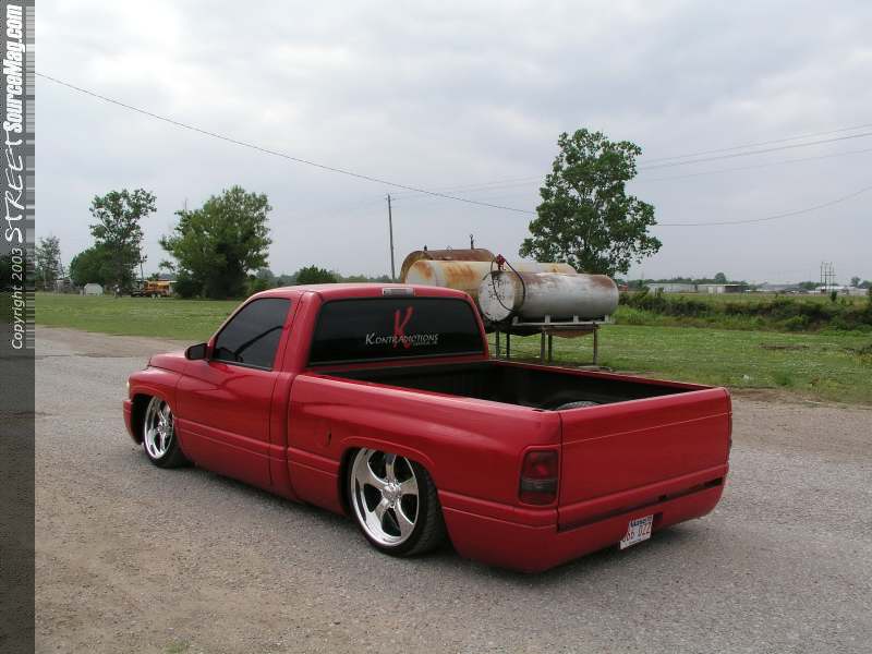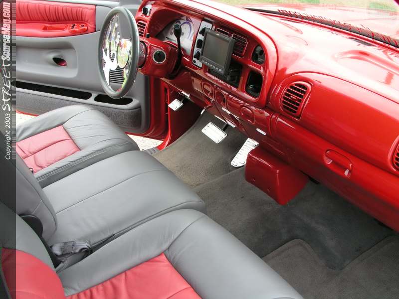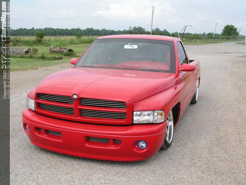 Matthew liked the clean design off the factory Dodge Ram Sport front bumper valance and grill combo, so after a quick stop at the local Ram dealership the new items were ready for Mike to add to the Ram. Matt prepped the truck for several heavy doses of 2000 Dodge Flame Red. Once Matt had the Ram looking it's best a billet Trendz insert was added to the grill and front valence areas.