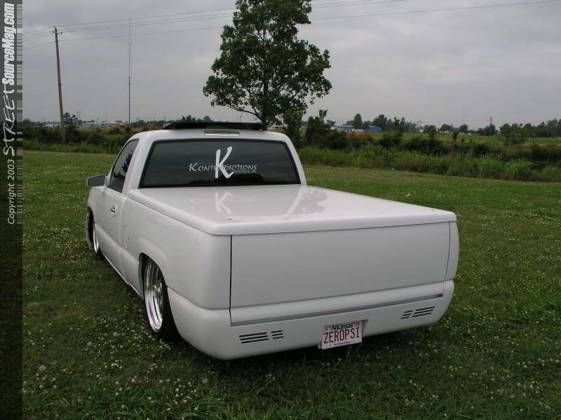 To cover any precious cargo Brooks might haul a Snug-Top fiberglass cover was installed onto the bed. Once Jack had the body looking righteous he then applied several coats of Standox White hue to the entire truck. Once the paint was dry a T-Rex billet grill insert was installed to complete the Denali conversion. The next major order of business was to visit Jessie Dickerson at AirRide by Jessie so the frame could be planted firmly on the ground. Jessie started by ditching the factory spindles in favor of BellTech 2" drop spindles. While the front end was torn down Jessie installed a pair of Firestone 2600 air bags were the coil springs once resided. For the rear Jessie custom built a 4-link cantilever set up with another pair of Firestone 2600's on the lower bars for more lift. Jessie then ran 5/8" stainless steel tubing from each bag and installed (8) Parker Gold 5/8" electric valves for complete control of each corner. Two Viar 450 compressors were plumbed thru two 5-gallon holding tanks for air on demand. A clean setup of Dakota Digital gauges were installed in the cockpit area to monitor each bags pressure at all times. Now that the Denali had the ability to get itself off the tarmac it was now time for some new rolling stock.