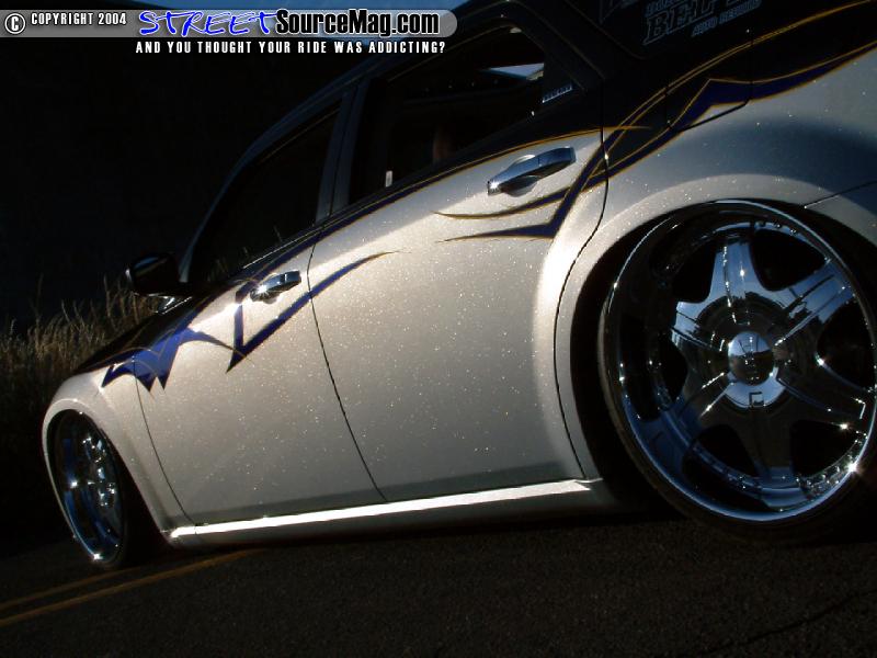 Now with a more luxury look and feel to the exterior confines, Scooter would have the Magnum dropped off to Bel-Red Auto Rebuild of Bellevue, WA. While at Bel-Red, Rich Little and the boys would spray down a House of color cobalt blue (UKO5) topcoat, pail gold (mbc01) mid coat and a base coat called shimron metallic (BC26) for the graphics.   PPG prismatic silver would then be used for the bottom two-tone scheme.
