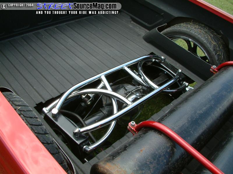Four 3-gallon tanks, nitrogen, Parker ½ inch valves and ½ inch line would run the system. Belltech drop spindles and control arms would then be installed to help bring the front down with the rear. The battery tray would need to be modified to allow room for the Boss 304 22x9.5 inch wheels wrapped in 285/30 Dunlop rubber. It would now be time to move to the exterior of his new ride.