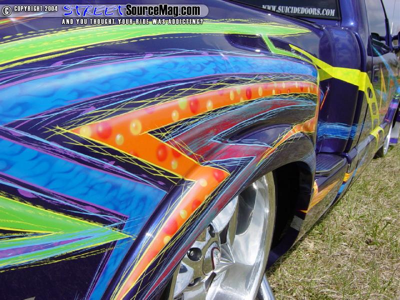 While the interior was stripped out to allow the graphics to be ran into the doorjambs, Nathan took this time to get the interior up to par with the new paint job. Most of the interior panels were wrapped in purple tweed and tan vinyl.  The stock seats were thrown out for a new set of Oldsmobile Brevada buckets. The door panels, headliner and seats all had flames sculpted into them before the material was put on.