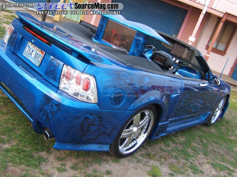 From a distance, as Brooke cruises this drop-top Mustang down the strip, the only thing you notice the wheels, twenty inch D’Vinci wheels wrapped in 255-35-20 rubbers. As the car draws closer the next thing you notice besides the thumping stereo is the paint but it isn’t until it is completely next to you that you notice the wicked airbrushing that covers Brooke’s Stang from head to toe.