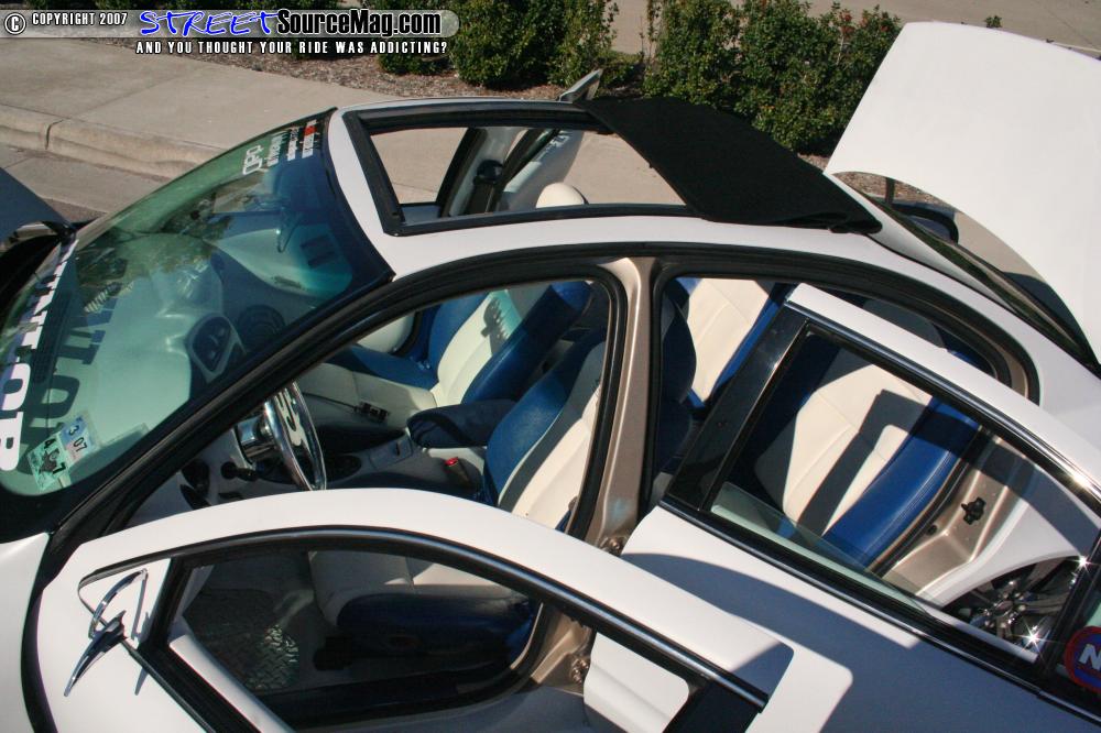Working everything together, blue suede would be found on panels, rear deck lid and headliner, while the seats where wrapped with Katzkin leather. Diamond plate floor mats are found on the new ACC Mats white carpet while a B.A.D. tribal flame steering wheel, Trenz rearview mirror and pedals are found installed to help finish things off.