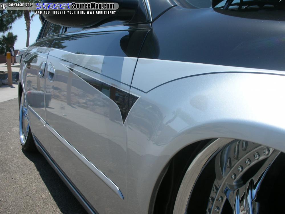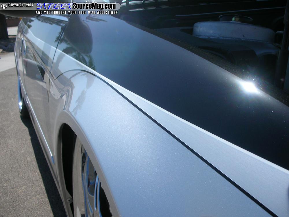 With the bodywork ready, Freddy would then spray down the base coats of PPG Silver Star and Jet Black. The 2-tone split would be covered by a brushed aluminum look with black and white pinstripping.