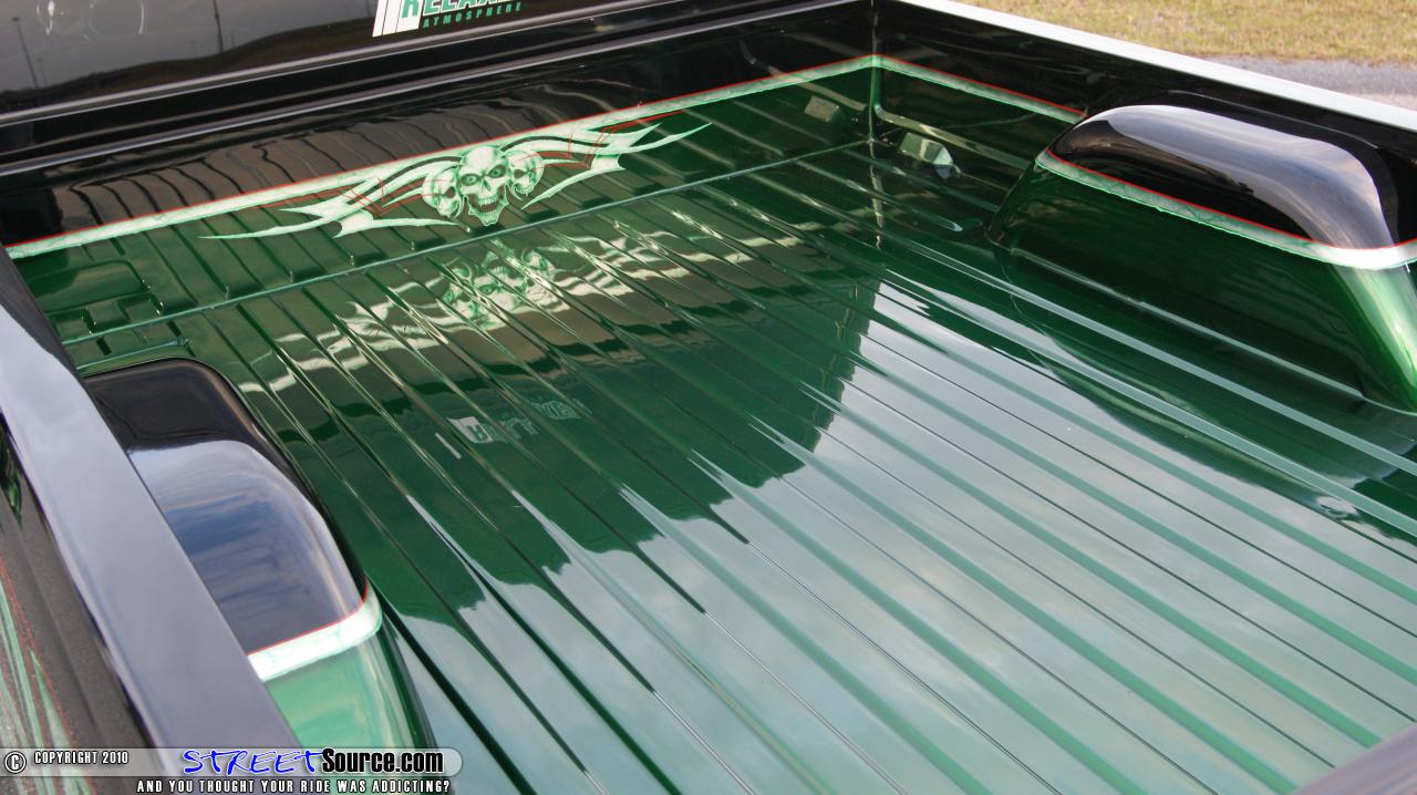 Although this truck has always been easily recognized by its smooth body and unique green and black two tone paint scheme, it too was showing its age. One of the doors and the inner bed floor began to have serious cracks in the body filler, along with other blemishes from use over time. Although it hurt to tear into such a nice paint scheme, Mellon stripped the door and redid all of the metalwork to both straighten and greatly reduce the amount of filler in the door. Moving along to the bed floor, Mellon began finding other areas that needed attention as well. But beyond the body and suspension work, the interior on the truck remained immaculate. The dash and door panels are still remnants of the original “Evil Twin” paint scheme while the other interior panels were wrapped in medium graphite leather and suede by Mike Sutton in Long Beach, California. Even more impressive is the ground-pounding system installed b y Ghetto Bob at 702 Motoring. The custom fiberglass box and floating center console house four 10” Orion subs while the custom fiberglass amp rack houses the Orion amplifiers. Two HE800 Kinetik Audio Powercells provide the juice to keep this system pounding.