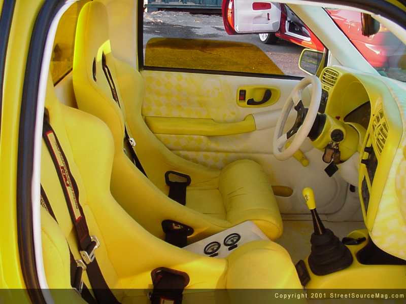 Now that the exterior was completed, it was time to get jiggy with the interior. The dashboard was covered with white leather and matching painted graphics. To fit in with the rest of the truck, the vents and miscellaneous dash accessories were also painted yellow. The Center console, which is painted to accent the interior and exterior, houses the AirLift airbag gauges and controls.