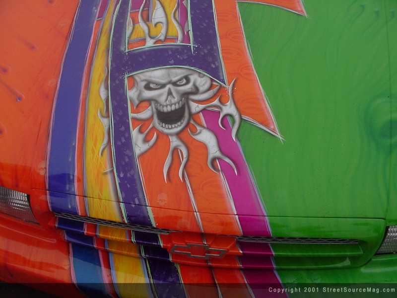 Not done yet, Max would then apply many different airbrushed skulls and what not bringing the entire paint job together. Maxed out Paintwurx, which is Max's business, is responsible for all of the body and paint applied to this eye-popping monster.