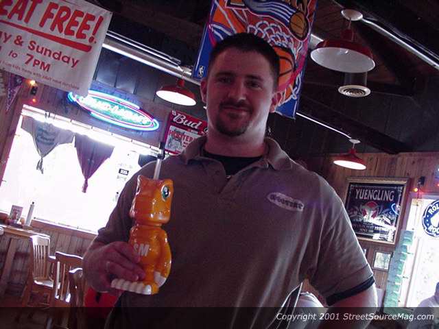 Chapter Three "Jacks first show"The date: 6/16/01 Jacks first show would consist of much enthusiasm as he scooped out every hot East coast girl in the grounds looking for someone to help manage his time effectively. Spotting one hot model, Jack proceeds to put his pimp on getting plenty of photo's to add to this here fine diary. Shortly afterwords, it was time to hit the pool where Jack was said to be the laugh of the party. Unfortunetly our cameras where all put away at this point so you'll have to trust Jack when he says the arm floaty was a relief keeping him from going underwater in the pool and spelling his refreshing beverage within. As the show came to an end, Jack persisted that we hit Hooters for his first ever apperance with the fine ladies which work there.Chapter Four "Jack invades Hooters!"The date: 6/17/01 First off, Jack would like to thank the nice manager of Hooters for allowing him to occupy his waitress' time while on the job.