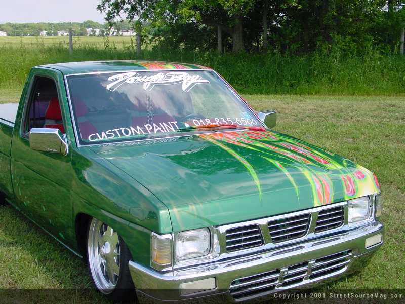 I think Todd's email address says it all in regards to his Nissan truck. Baddass91Nissan is Todd's address and need I say more? Todd and his dad, Todd, made this truck what it is today. The Nissan is extremely modified from bumper to roll pan. At first glance you see the antenna is shaved along with the doors, hood squirters and emblems. The gas door was removed and relocated into the bed. The stock fenders were chunked for the 4x4 variety along with a Toyota 4x4 front bumper.