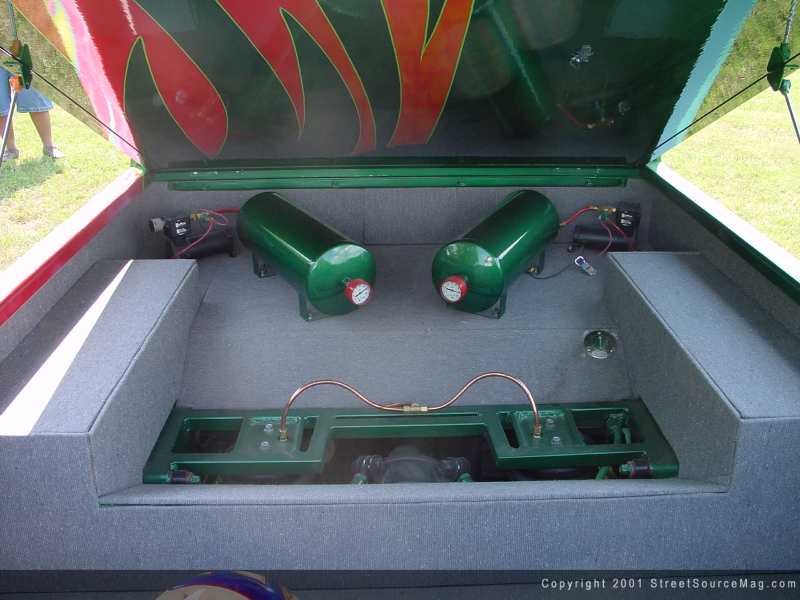 The truck touches the earth just a little closer then the manufacturer suggested height thanks to a set of Bell-tech spindles, which have been mounted up to a front airbag setup compliments of the Hack Shack. Matching the ground-hugging disposition of the front with a fully custom setup on the rear would be the next step. Most people decide to go with a trusted name, like TCI or Alter Images to get a step notch or 4-link. The "Todds" gave those ideas two thumbs down. "Why pay for it when you can build the exact same thing" The whole rear end of this Nissan was built on that statement. The father and son team hand fabricated the 4-link, and step notched the rear frame rails to allow the air-ride to work to the fullest.