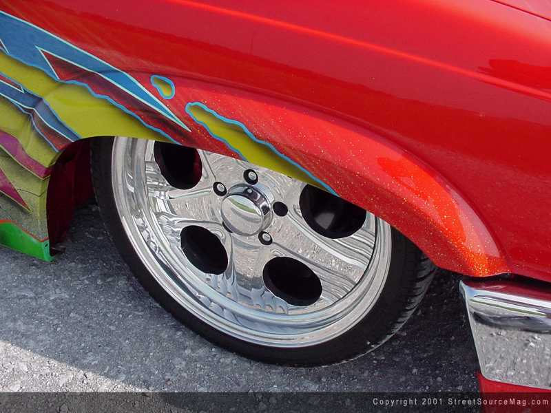 To keep people shaking their heads from show to show, large wheels were a necessity. With that in mind, the folks at Nitro were contacted. Up front, Nitro Hollywood in the 18" variety were installed wrapped in 225-25-18 rubber. Out back,, large Nitro Hollywood 20"s were installed, with 245-35-20 rubber wrapped around them.