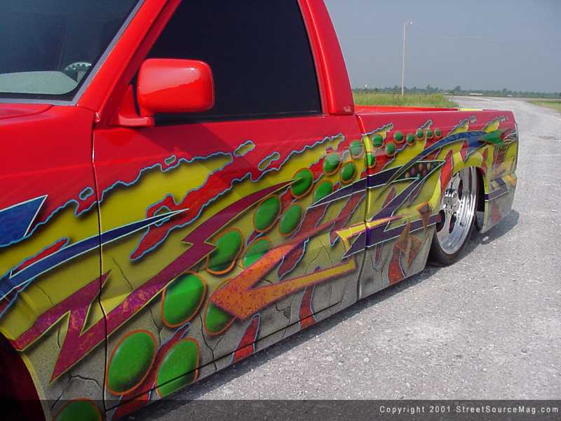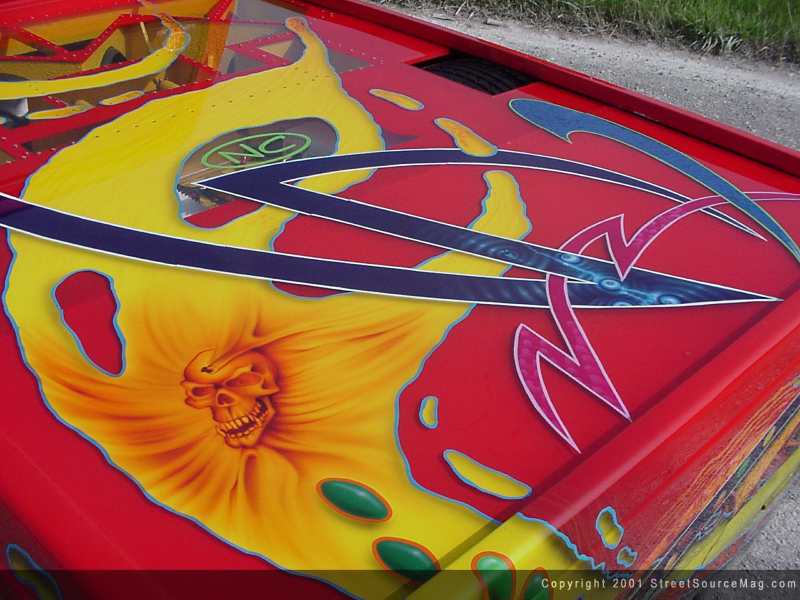 Many different designs were laid down across the hood and panels of this Mazda, carrying over the to rear custom speaker box enclosure.   After finishing up the Mazda with a ton of PPG pinstripe colors, Randall laid down enough clear to make the Mazda look like glass. The outcome was spectacular.