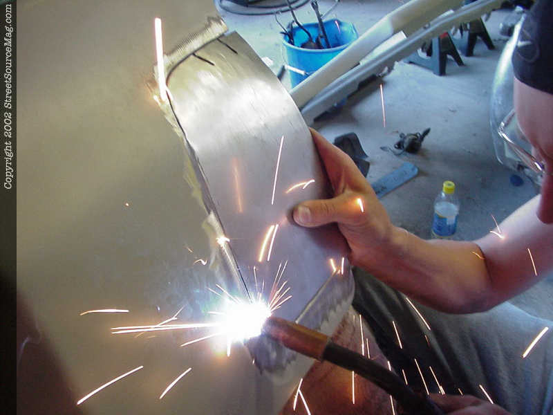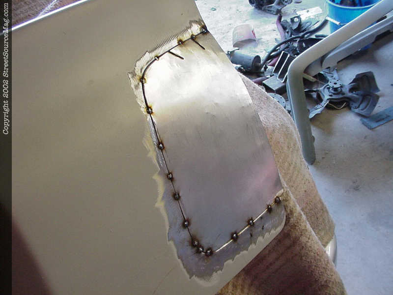 4. Helping to get the correct curve in the bodyline, John put to inch and a ½ slits to get the upper corner to bend correctly before starting his welds. 5. Happy with the fillers, it is time to start tacking to sheet metal into place. 6. The bottom of the filler didn't quit won't to roll as we liked so it was pulled out with a set of pliers and then tacked into place as liked.