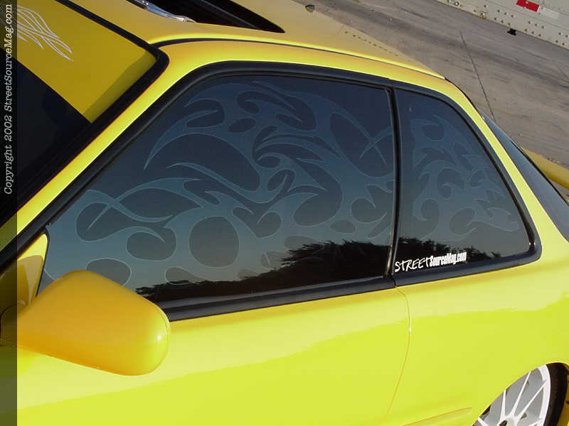 Next Regan would have the crew from Legends Auto Collision of Oklahoma City shave the door handles, emblems along with installing a set of Stanley 1 piece headlights. Helping bring a new look to the rear, Regan would install a set of Altezza style Euro clear taillights.   To bring a twist to the car, the windows would take on a complete new look. The tint would be cut and designed by Grasshopper designs in a tribal design, and laid down by Pro tint of Norman, Oklahoma.
