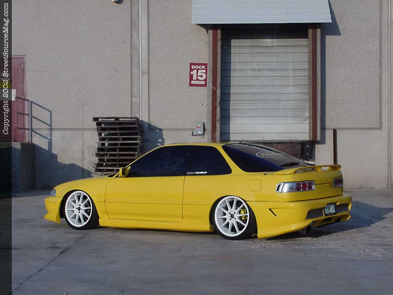 Keeping with the custom appearance, the rear seats would be removed completely. The dash would then be accented with a carbon fiber dash overlay and the vents would be painted yellow. Regan would then ditch the stock gauges for a set of APC indiglo gauges, and the rear view mirror would then be replaced with a video monitor. The interior not yet complete, Regan would now leave his Integra in the hands of Extreme Customs for some video and audio expertise.