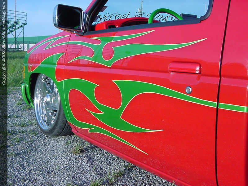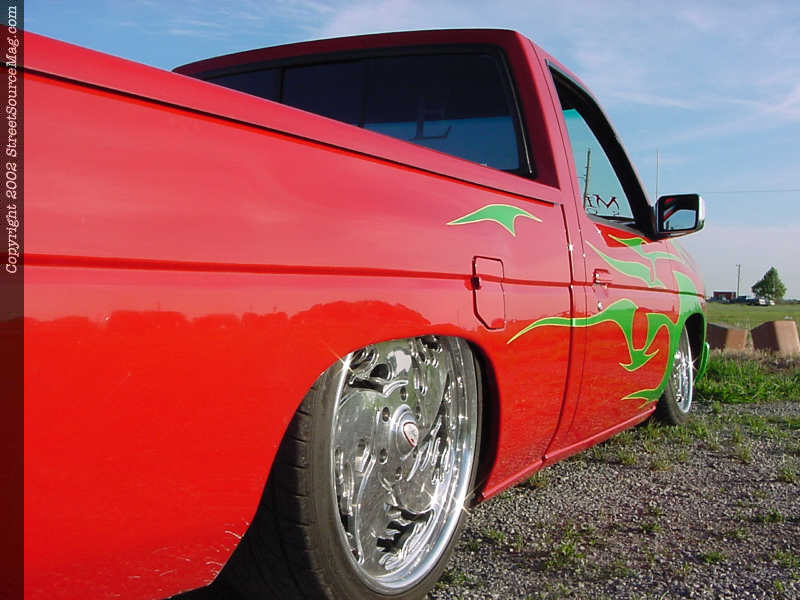 For rolling stock Kyle called upon his buddy "discount Joe" to help him find the perfect wheel/tire combo. Joe picked out the Boyd Coddington el Diablo's for Kyle and had them shipped out to him, but unlike most new comers Kyle went big on his wheels, mounting up 18's in the front and 20's in the rear both wrapped in Nitto 550's.