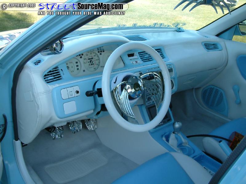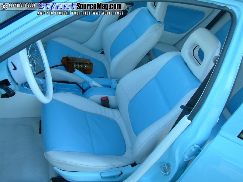 The seats would then all be wrapped in white and baby blue vinyl to help bring things together. An AIM control Panel would then be installed and the vents in the dash would all be sprayed baby blue. To finish off the interior, a 1 off custom center console would be installed housing a PS1. Jason Dunn of Salem Or, is responsible for the interior needs.